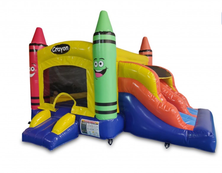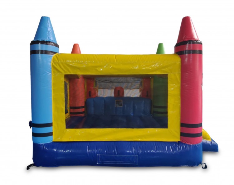Our Mini Crayon Bounce House Slide is the perfect bounce house with slide for younger kids to enjoy. This compact and lightweight design features gender neutral colorful designs. The Mini Crayon Bounce House Slide features a dual lane slide to add some extra fun while riders bounce.