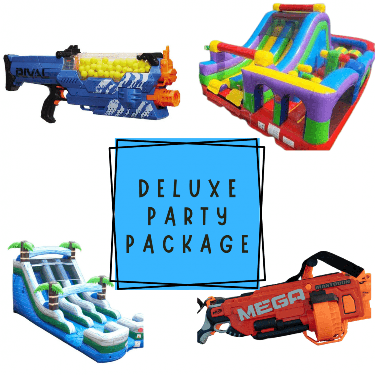 Deluxe Party Package — everything you need to turn a regular get-together into a full-on celebration. This all-in-one rental bundles a large inflatable play course or slide (choose one of the included styles). These options are bright, durable, and designed for nonstop climbing, sliding, and bouncing, plus Nerf Rival or Nerf Mega Wars package blasters. For an additional charge, optional concealment barrels or a Capture the Flag setup is available to create an action-packed arena.