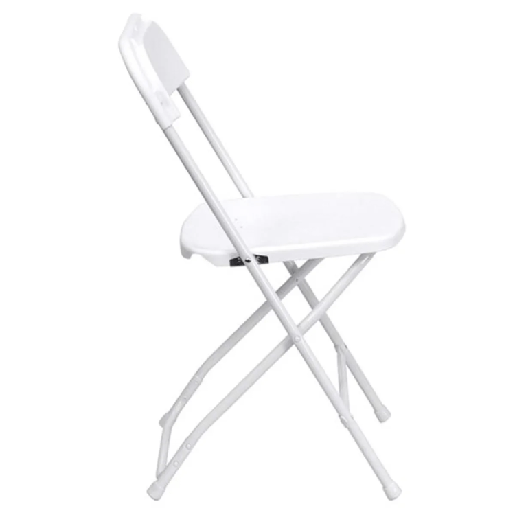 A dependable, no-fuss white folding chair built for events — lightweight to carry, folds flat for easy transport and storage, and contoured plastic seat and back for simple everyday comfort; powder‑coated steel legs with PVC tips resist scratches and stand up to repeated setup, making it ideal for weddings, banquets, outdoor ceremonies, conferences, or extra seating for parties where you need a clean, uniform look and reliable seating that’s quick to place and remove.