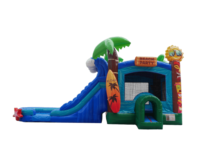 Introducing our 5 in 1 Aloha Combo Wet/Dry. With its beautiful tropical-them, 3D surfboard and cool sun, and beautifully printed Tiki graphics, this combo is the perfect addition to your inventory. Great for any event or party, this combo jumper comes with a dual water slide making it fun for anyone. The 5 in