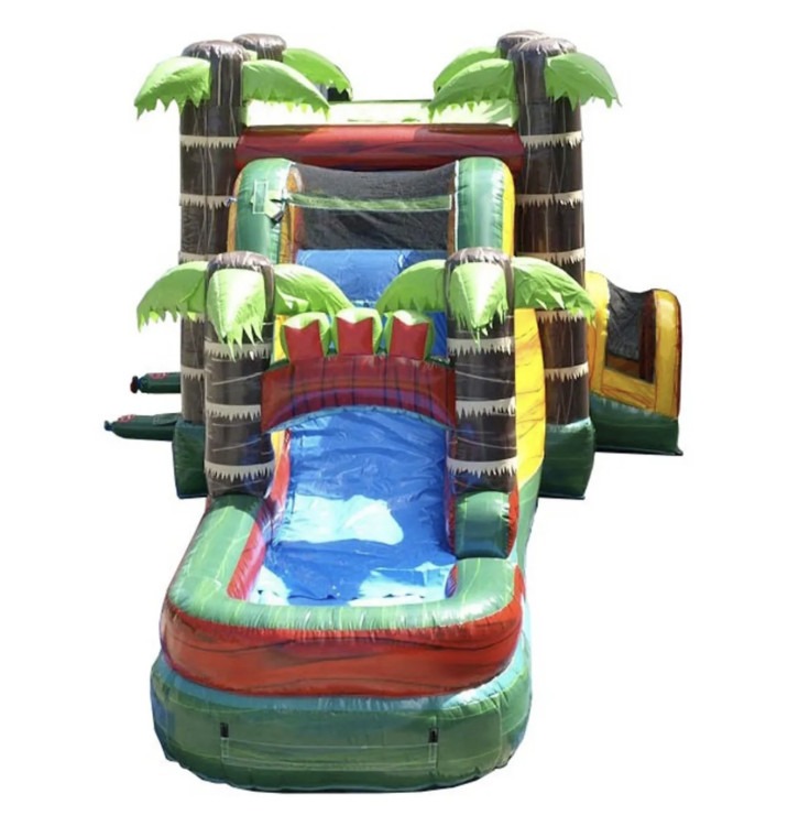 Take the fun and excitement of jumping and playing in a Bounce/Slide Combo and MEGA SIZE it with the Mega Tropical Fire Marble Water Slide Bounce House Combo! From the bright, vibrant colors, to the spacious bouncing area and incredibly fun big slide, kids can't help but look at these units in awe. This unit stretches out for 32' feet of fun, exciting activities that may even have a few parents secretly wanting to jump in! Crawl into the bouncing area through our upgraded, enclosed tunnel entrance. Have a blast jumping, bouncing and laughing the day away on this mega bouncer! It even has a basketball hoop inside the bouncing area for extra fun! Climb up the short rock climb wall to get a view of the flowing water down the slide. Get ready, then head down into the splash pool at the bottom for a grand finale and some photos for the scrapbook! The Mega Tropical Fire Marble Water Slide Bounce House Combo brings everything needed to the party to have a great time, and fill it with all the joy that kids (and adults!) want on a fun, exciting and memorable play day. Simply connect the built-in misting system to a standard garden hose to create the water slide or leave the water off and use it without water for an equally good time.